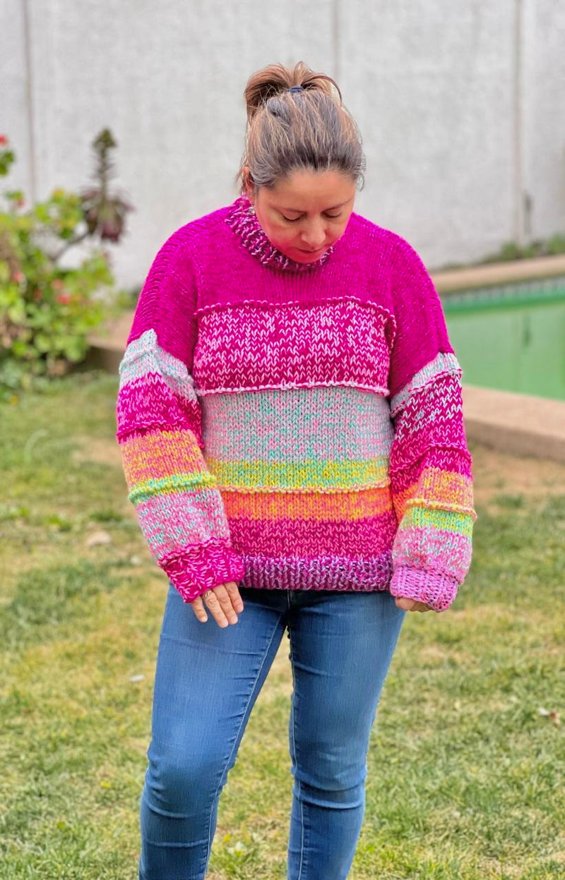 Aprende a tejer uno de mis diseños más populares con la clase grabada + él patrón. Miles de personas ya aprendieron a tejer su primer sweater a dos agujas gracias al Candy Crush.