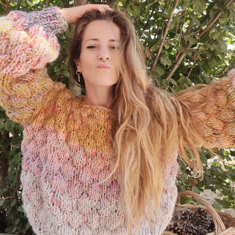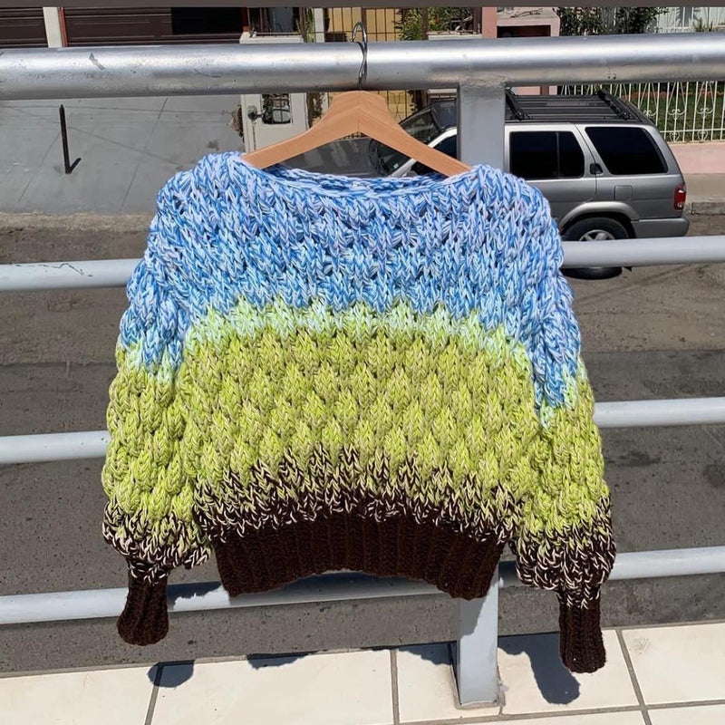 Teje el Rainbowfish Sweater, el primer diseño que se me viralizó en redes sociales y que vendía como pan caliente, con el patrón que incluye 11 video clases grabadas, instrucciones escritas paso a paso, incluyendo cómo mezclar colores y crear la mezcla arco íris y casi sin costuras. 💕 🌈